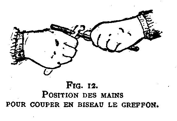 Couchez le rameau dans votre main gauche entre le pouce et l'index; placez votre main droite qui tient le greffoir en regard de la gauche, de manière à ce que l'extrémité inférieure du greffon arrive dans cette main droite, la lame de l'outil étant placée obliquement et en avant du rameau (fig.I2).