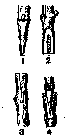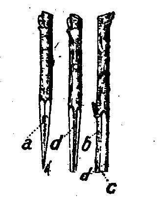 Pratiquez deux biseaux opposés et égaux, en lame de couteau; non pas comme on les représente souvent a (fig. I3), mais avec un dos b plus épais que l'autre (fig. I3),