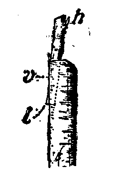 3° Pour insérer le greffon dans la fente du sujet, saisissez le premier avec les doigts de la main droite et enfoncez-le verticalement, en ayant soin que la tranche d'écorce la plus épaisse, laissée entre les deux biseaux, soit placée extérieurement, affleurant â peine l'écorce du sujet. Veillez à ce que les zones génératrices des deux parties coïncident; imitez les praticiens qui, pour assurer le contact, au moins en un point v, inclinent très légèrement le greffon, cherchant à faire .déborder de l'écorce sa base 1, et à faire rentrer son sommet h (fig.14).