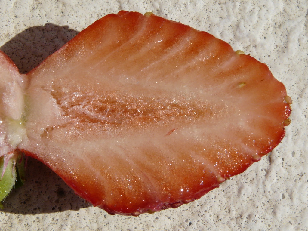 rouge orangé, moyennement ferme, akènes jaune-verdâtre