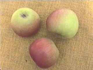 Ronde, régulière dans ses grandes lignes, jaune, rayée de gris roux comme cox, mais plus terne et manquant de couleurs vives