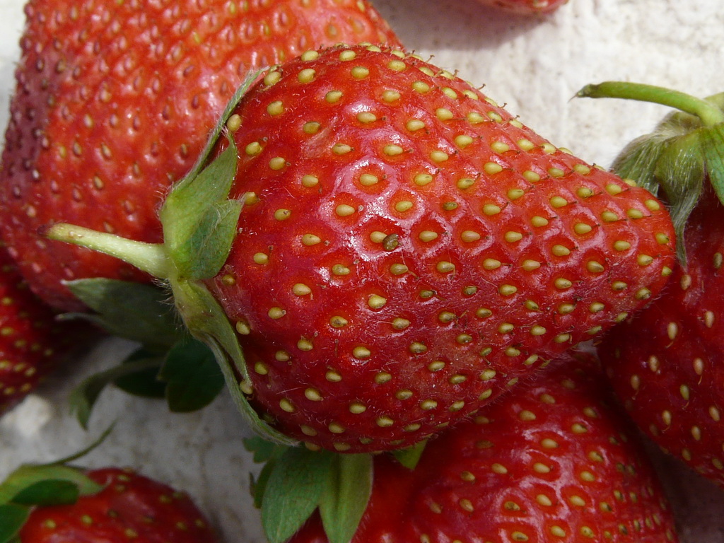 rouge orangé, moyennement ferme, akènes jaune-verdâtre